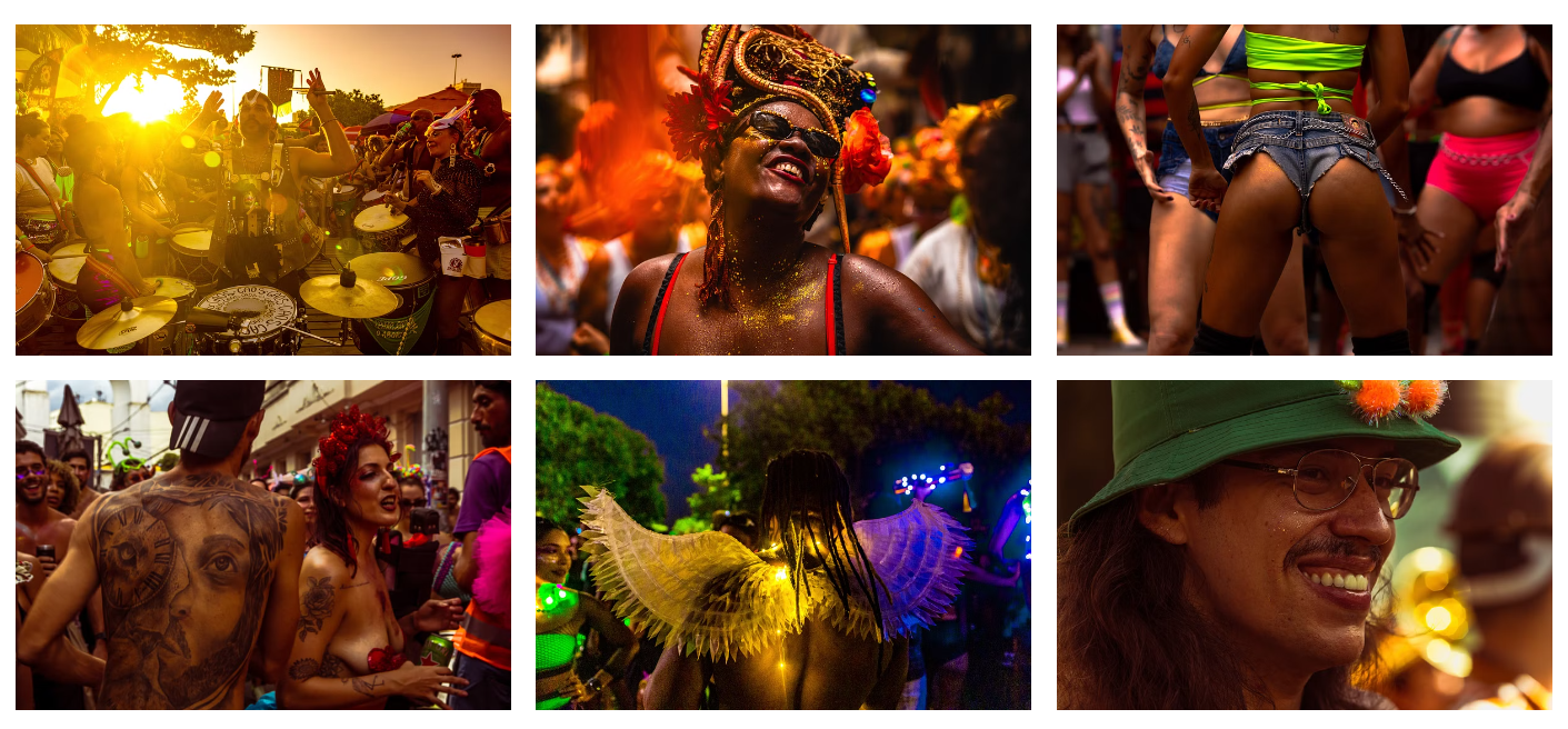 JP+Moscow realizam, sem qualquer combinação, experiências estética e etnográfica durante a época do carnaval carioca. Seja na Sapucaí ou nas ruas, ao vivo ou de forma híbrida, por anos estiveram de plantão cobrindo o evento para jornais, sites e redes sociais. Neste ano, registraram blocos de cortejo no Centro, Estácio, Tijuca e Aterro do Flamengo. Foram a trabalho em ensaios fechados, públicos, desfiles e cortejos antes, durante e depois do carnaval.